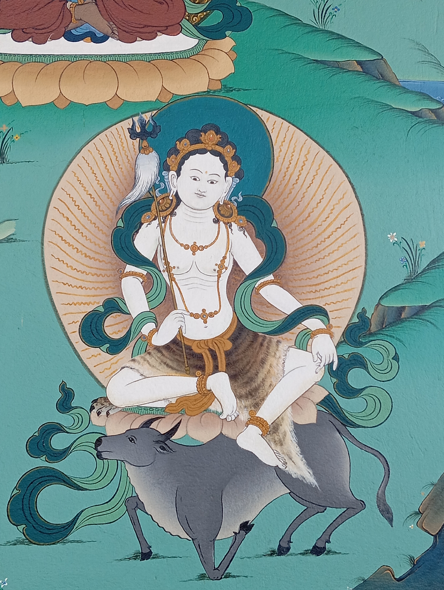 The image is a section of a Thangka painting, likely a depiction of a Buddhist or Hindu deity. The primary figure, seated in a meditative pose, has pale skin, dark hair adorned with jewelry, and minimal clothing. They are seated atop a grey bull on a lotus flower cushion. Behind the figure is a large golden halo. The surrounding environment is painted in shades of turquoise and depicts stylized hills and vegetation. The origin of the image is in Oshojetban, Nepal, but there is no further details about the actual location of the painting in the city.