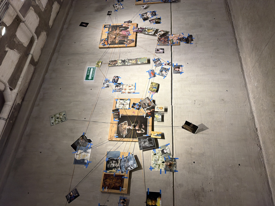 The image displays an indoor art installation on a light gray concrete wall within a building in the city of León, Mexico. The ceiling is also concrete, featuring exposed white-painted conduits and recessed spotlights. The floor is a lighter-toned concrete. The wall is covered with an intricate display of numerous photographs and prints of varying sizes and orientations. These items are predominantly secured directly to the concrete wall and to several rectangular wooden boards using blue painter's tape. Thin, dark-colored strings or threads connect various photographs to each other and to the wooden boards, creating a web-like pattern across the wall. The displayed images include a diverse range of subjects such as portraits, stylized figures, abstract patterns, and landscapes. A green emergency exit sign, with a white arrow pointing right and the text "RUTA DE EVACUACIÓN" (EVACUATION ROUTE), is visible on the upper central portion of the wall. No individuals are present in the scene.