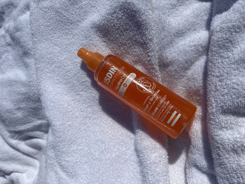 An overhead shot shows a bottle of ISDIN Hydro Oil sunblock laying on a white towel in the sun