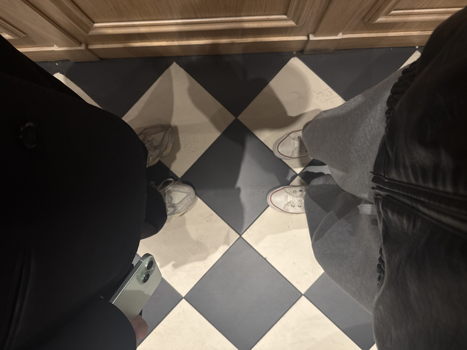 A top-down view depicts two individuals standing on a black and off-white checkered tile floor. In the foreground, the first subject wears light grey sweatpants, white low-top canvas sneakers with red trim, and a dark zippered garment. The second subject, positioned further back, wears dark trousers and light-colored chunky athletic shoes. A light green or silver smartphone with two prominent camera lenses is held near the second subject's hip. To the right, vertical light-colored wooden paneling or a door frame is visible. The exact venue in Yerevan, Armenia, cannot be definitively identified from the visual evidence; however, the interior design is consistent with a modern café, restaurant, or retail establishment commonly found within the city.
