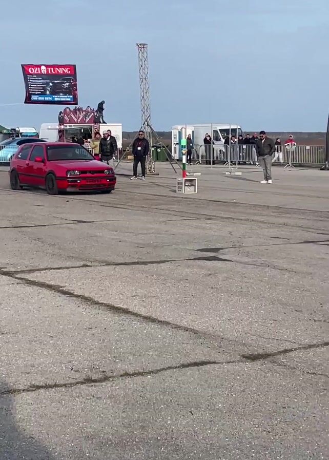 red Volkswagen Golf Mk3 performing a burnout at a car event. The car is on an asphalt surface with several dark skid marks and tire smoke in the air. There are people standing behind a metal barricade observing the action. In the background, there are tents, flags advertising “OZI TUNING” and “Tito Car”, and other vehicles. The day is overcast with a visible horizon of green fields.