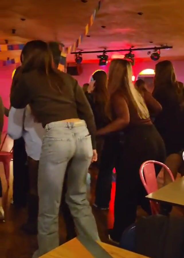 group of people dancing in what appears to be a restaurant or club. The lighting is dim with colorful stage lights illuminating the scene. Several women are seen dancing together in a somewhat enclosed group, moving to the music. The room is decorated with festive banners. There are tables and chairs visible, suggesting a dining area that has been converted into a dance floor. A DJ can be seen performing in the background.