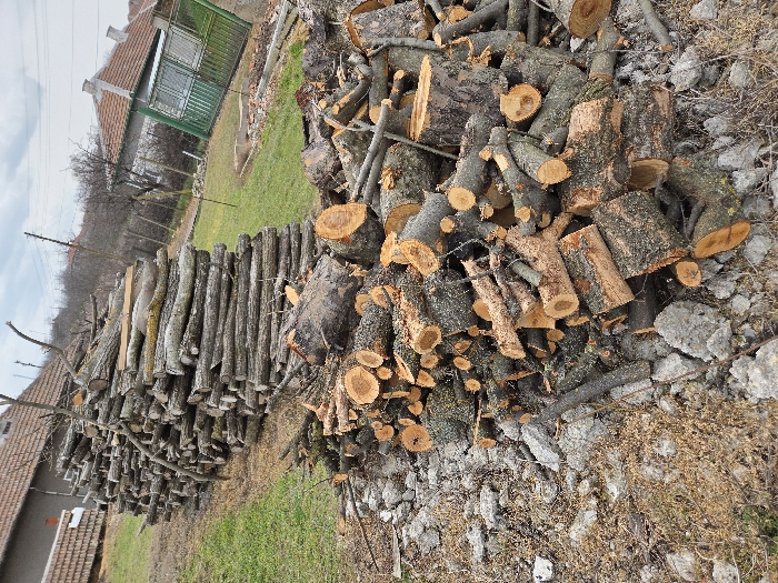 The image depicts a rural outdoor scene in Cherkovitsa, Bulgaria, under an overcast sky. In the foreground, a substantial pile of freshly cut logs and tree branches is scattered over rocky, dry earth and scattered debris. The logs exhibit varied diameters and visible saw marks on their cross-sections, indicating recent processing. Immediately behind this pile, extending uphill towards the left, is a large, neatly stacked woodpile composed of numerous uniform logs. To the right of the stacked woodpile, an expanse of green grass is visible, partially obscuring a metal fence. In the midground and background, residential buildings with distinct reddish-brown tiled roofs are visible, along with utility poles and bare deciduous trees on distant slopes. No individuals are present, and no active interactions are observed.