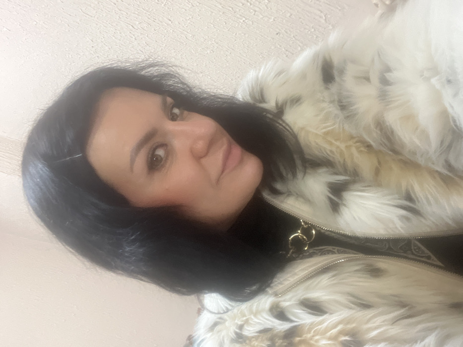 A single adult female is depicted in a close-up photograph. She has dark, shoulder-length hair, styled with a silver hair clip visible on her left side. Her facial features include dark eyes and defined eyebrows; her lips are closed. She wears a black turtleneck under a partially zippered multi-colored faux fur coat, primarily white and tan with dark patches. A gold-colored chain necklace with interlocking rings is visible around her neck. The subject is looking directly at the camera. The background is a plain, light-colored, textured wall. The specific location within Smederevska Palanka Municipality, Serbia, cannot be determined from the visual information provided.