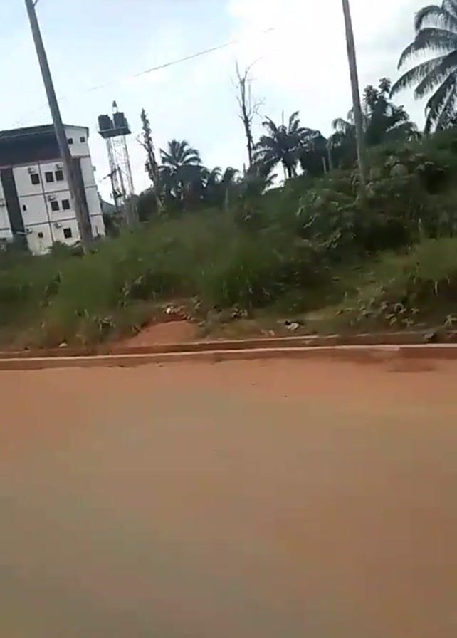 road in what appears to be a tropical area. On the left side of the road is a hotel with multiple floors and a water tower. On the right side of the road is a grassy area with palm trees and other vegetation. Smoke is rising from the vegetation at the right of the video. The road itself is brown and appears to be made of dirt or clay. There are power lines overhead. The sky is cloudy.