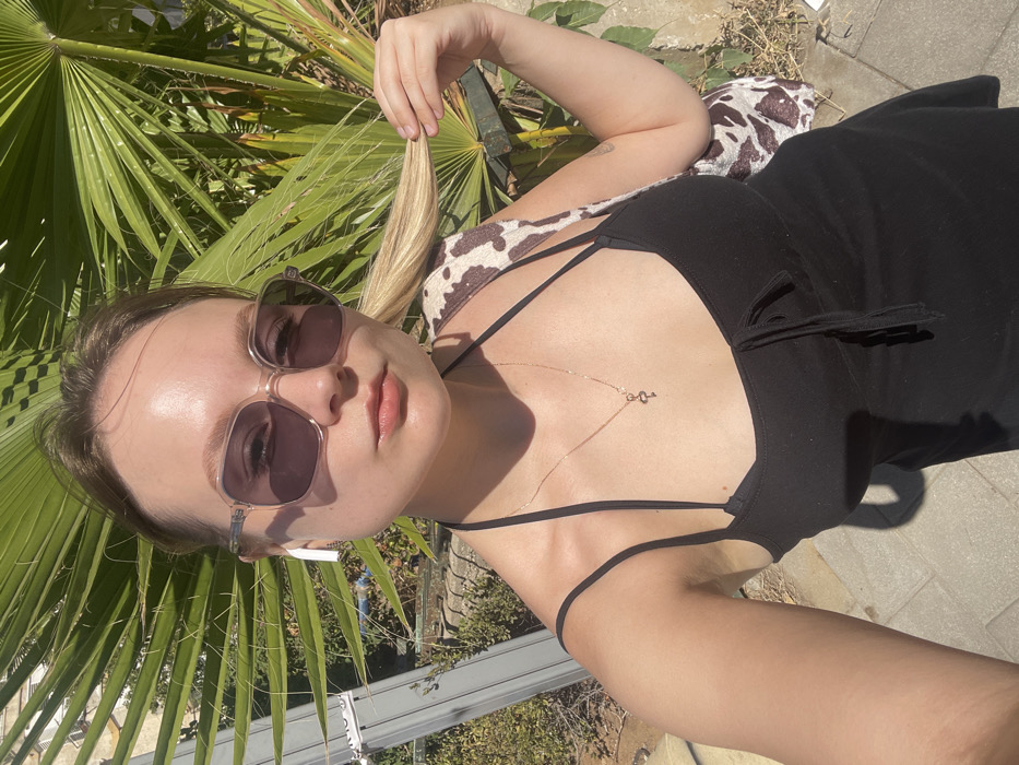 A fair-skinned individual, presenting as female, is depicted in a waist-up outdoor selfie taken in Bat Yam, Israel, under bright sunlight