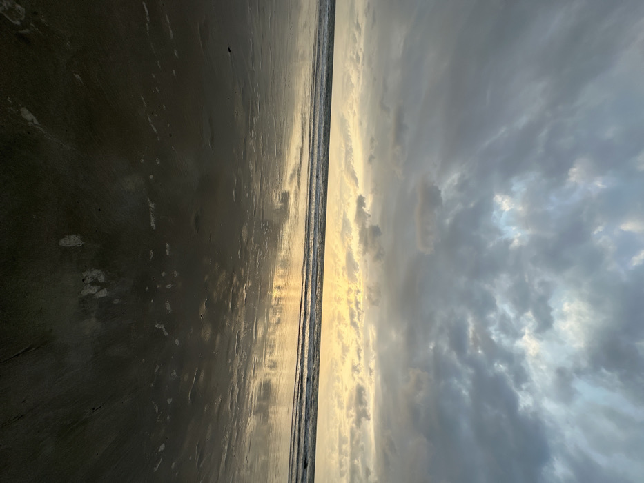A horizontally oriented view captures a beach at twilight. To the left, wet sand reflects the fading light. A thin strip of ocean divides the beach from a dramatically cloudy sky on the right. The clouds are layered, with hints of sunset color peeking through. The horizon is blurred. The image gives a sense of calm and the end of a day.