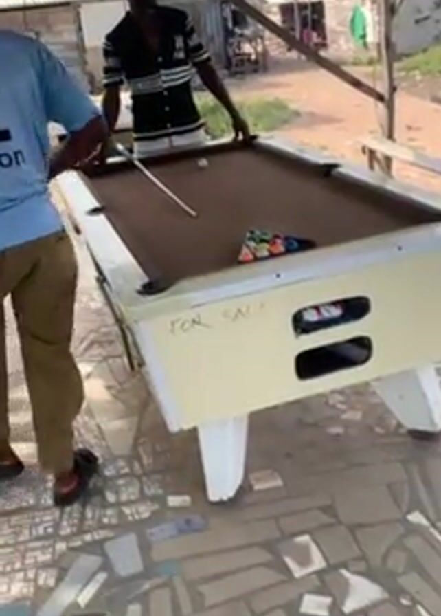 Two men are standing around a pool table with the balls still racked. One man, wearing a light blue shirt with the number 12 and the name Wilson on the back, is crouched down, apparently lining up a shot. He is wearing khaki pants and dark sandals. The second man is wearing a black and white shirt and black pants, and is standing near the side of the pool table. The table is cream-colored with a brown playing surface. "FOR SALE" is written on the side of the table. The floor is a patchwork of colorful tiles. The area is covered by a corrugated metal roof supported by wooden beams. In the background, there are basic buildings and trees. The overall setting appears to be an outdoor or semi-outdoor space, possibly in a less developed area.