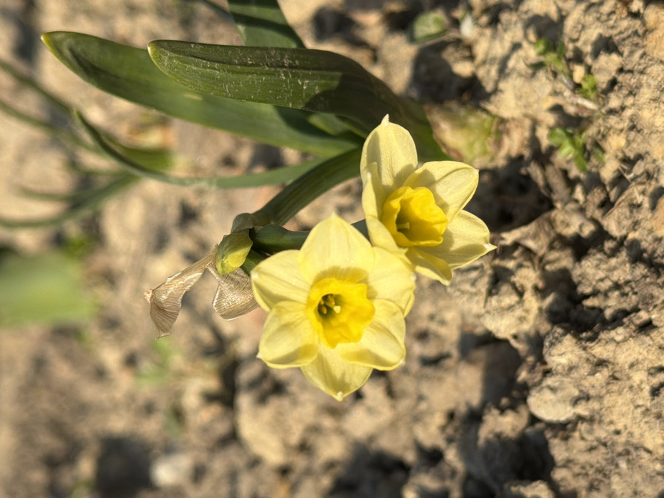 The image depicts a close-up, outdoor scene in Kilifarevo, Bulgaria, featuring two fully bloomed yellow daffodils (Narcissus). The flowers are positioned centrally and to the lower right of the frame, each displaying six pale yellow perianth segments surrounding a darker yellow, trumpet-shaped corona. The top daffodil is slightly larger and more prominently in focus than the one below it. To the left and slightly above the upper flower, a single unopened daffodil bud, bright yellow-green, is visible alongside a dried, light brown, papery sheath partially enshrouding the stem. Several broad, dark green leaves of the daffodil plant extend upwards and to the right from the base. The immediate foreground and blurred background consist of dry, light brown, clumpy soil with scattered small green sprouts. The scene is illuminated by natural light, casting subtle shadows and highlighting the texture of the soil. A third daffodil plant with green leaves is partially visible, blurred, in the upper right background. No people or animals are present.