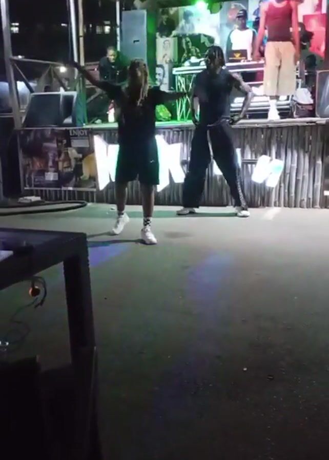 two people dancing on a dance floor in front of a stage at an outdoor venue. The person on the left has long dreadlocks and is wearing a black t-shirt, black shorts, and white sneakers. The person on the right is wearing a black t-shirt, black pants, and white sneakers. They are performing a dance routine that involves synchronized movements and partner work. The stage behind them is lit with colorful lights, and there are several people on the stage, including a DJ and a band. The word "MAKTUB" is lit up in large letters on the front of the stage. There is a table in the foreground, and the venue appears to be outdoors at night.