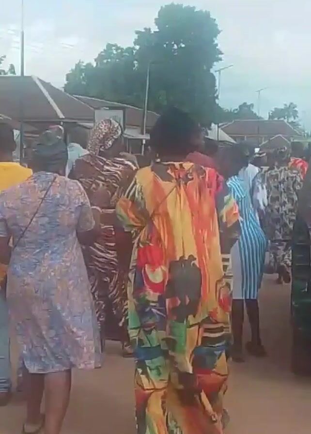 A crowd of people is walking down a street. The people are of various ages and are dressed in a variety of clothing. There is a small truck on the right side of the frame. The environment appears to be a small town or village. The video is slightly shaky, indicating it was likely taken while walking.