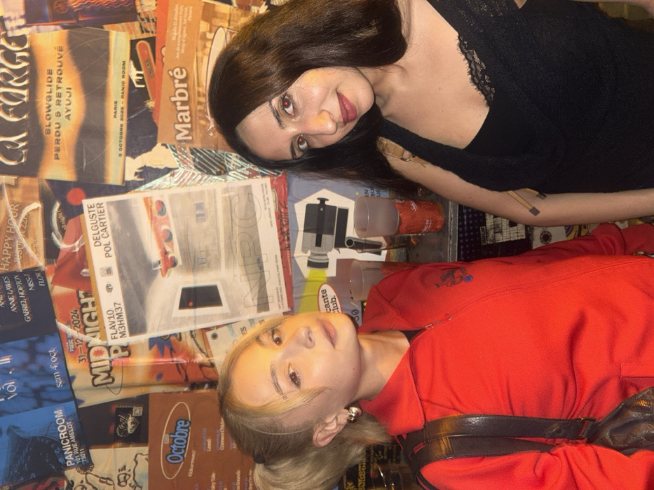 Two young adult females are posing for a photograph indoors at an establishment in Paris, France, identified by numerous event posters on the background wall, including references to "Panic Room" at "101 Rue Amelot" and "Paris