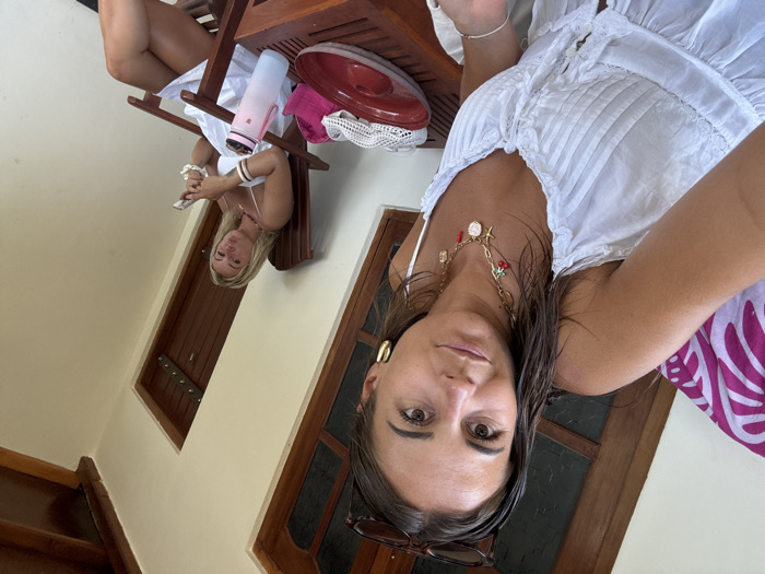 The image displays two females situated on what appears to be a covered porch or balcony in Mirissa, Sri Lanka