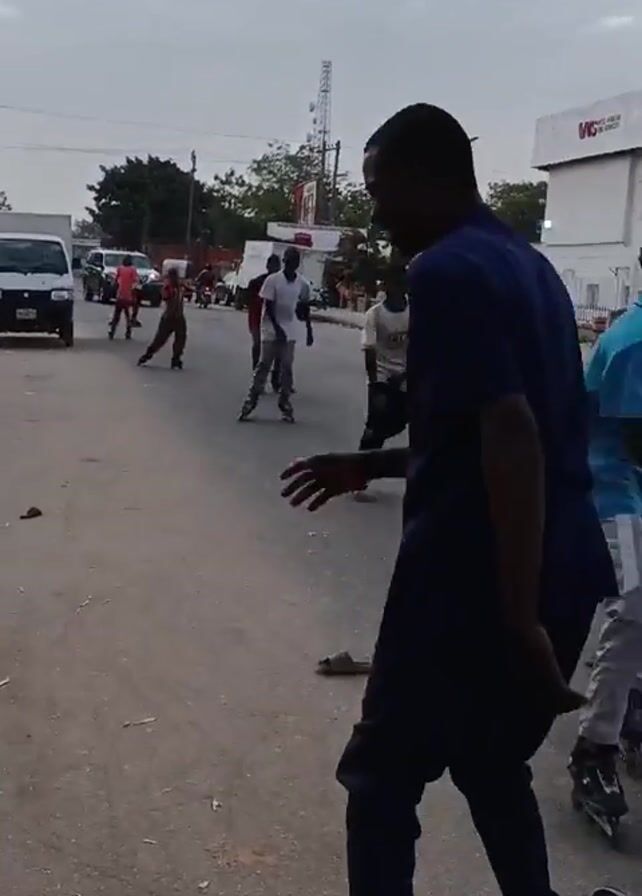 several people roller skating on a paved road. There are multiple skaters, including children, and some adults who appear to be accompanying them. The skaters are wearing casual clothing. Some discarded sandals are on the road. Vehicles are parked or moving on the road, including a white van and a gray SUV. Buildings and trees are visible in the background, and the sky is overcast. One person is holding a camera, seemingly capturing the skating activity.