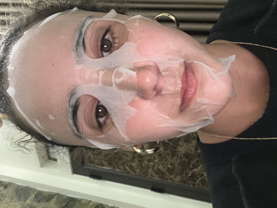 - "A close-up image depicts a person with medium skin tone and dark, curly hair, wearing a white facial sheet mask" by FM-bmo3E3, licensed under CC BY 4.0