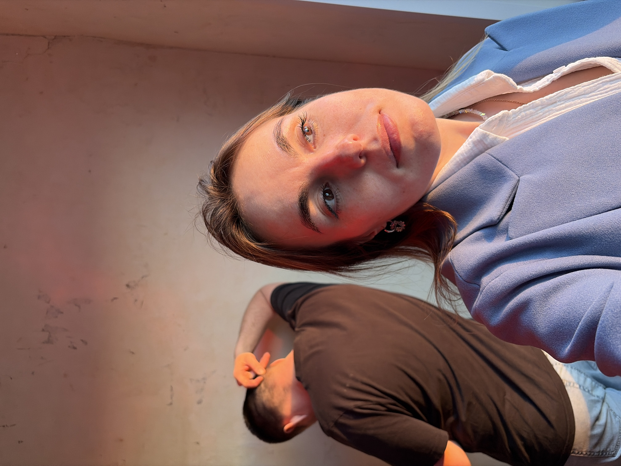 A low-angle shot depicts a woman's face in the upper-right quadrant. She has light skin, brown hair, and is wearing a light blue blazer over a white shirt, and a pearl necklace. An earring is visible. In the lower-center of the frame, a man is leaning over, wearing a black shirt. A portion of the cement background is lit by reddish light. The location is unspecified.