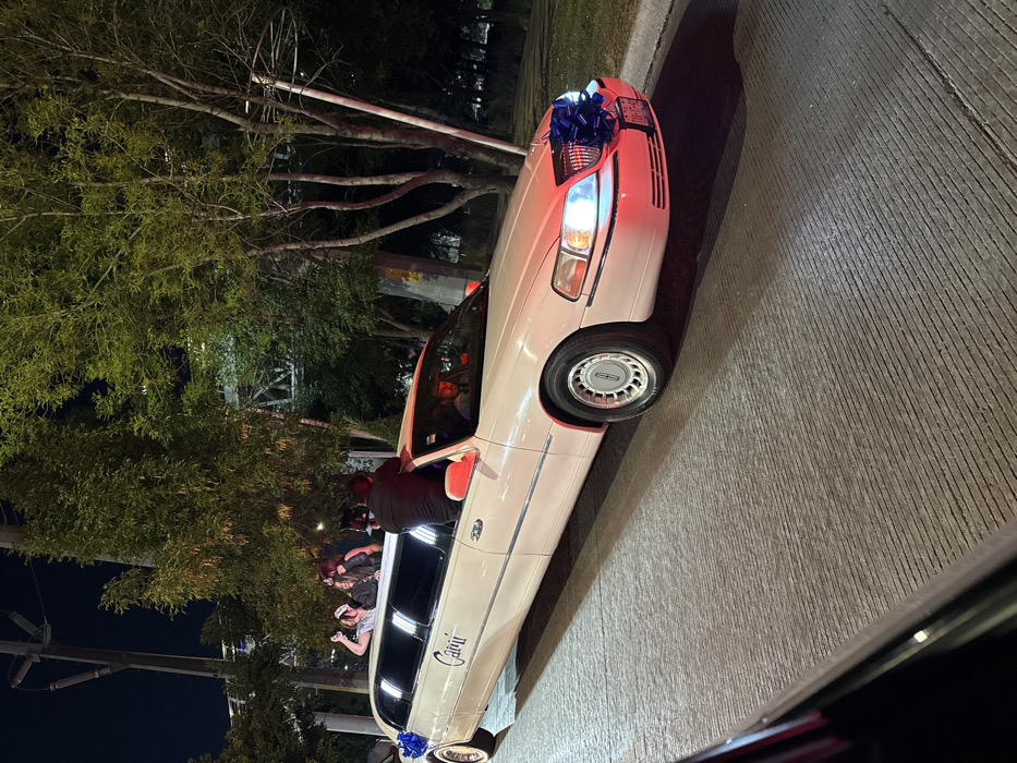 A stretched white limousine, adorned with blue bows, is parked on a textured concrete surface. People are visible inside, some leaning out of the sunroof and windows. The word "Cari" is visible on the side of the limousine. Trees and lights are in the background, suggesting an evening or nighttime setting. A car is partially visible in the lower right corner of the image.