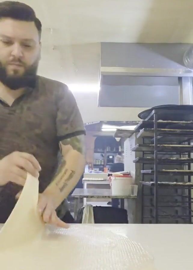 A man with a beard stretches a large, thin sheet of dough in a commercial kitchen. He lifts and shakes the dough to increase its size. Other individuals are visible in the background, engaged in kitchen activities. A metal rack with baking sheets is also in the background. The kitchen environment appears functional, with standard commercial appliances and workspaces. The scene is brightly lit, highlighting the dough and the man's actions.