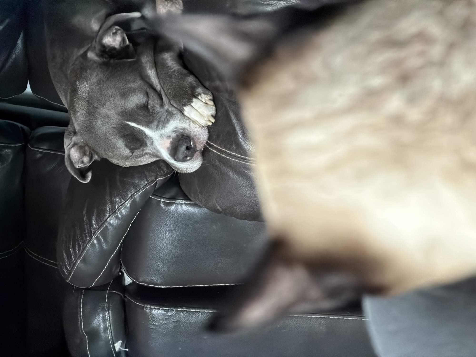 A gray and white dog is sleeping on a dark leather couch. Part of a Siamese cat is visible in the foreground, out of focus. The location is unknown and the scene is indoors.