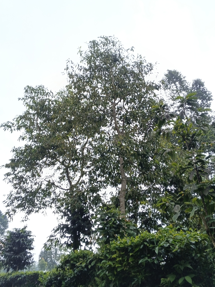 The image displays an outdoor, natural environment primarily composed of dense vegetation under a bright, overcast sky. A prominent, tall tree with a light-colored, vertically textured trunk and a full canopy of dark green leaves occupies the central and upper frame. To the right, a second tree with similar foliage is partially visible. In the foreground, a dense, uniform hedge or row of shrubs with vibrant green leaves spans the width of the image. Faint, indistinct outlines of additional trees or distant vegetation are discernible against the bright sky on the left. No individuals, structures, or specific actions are present. The location is Unknown, Vietnam.