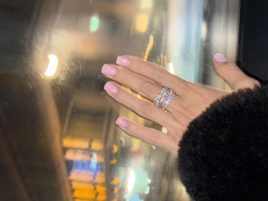 A hand with light pink, square-shaped nails rests against a window, adorned with a large, multi-row diamond ring