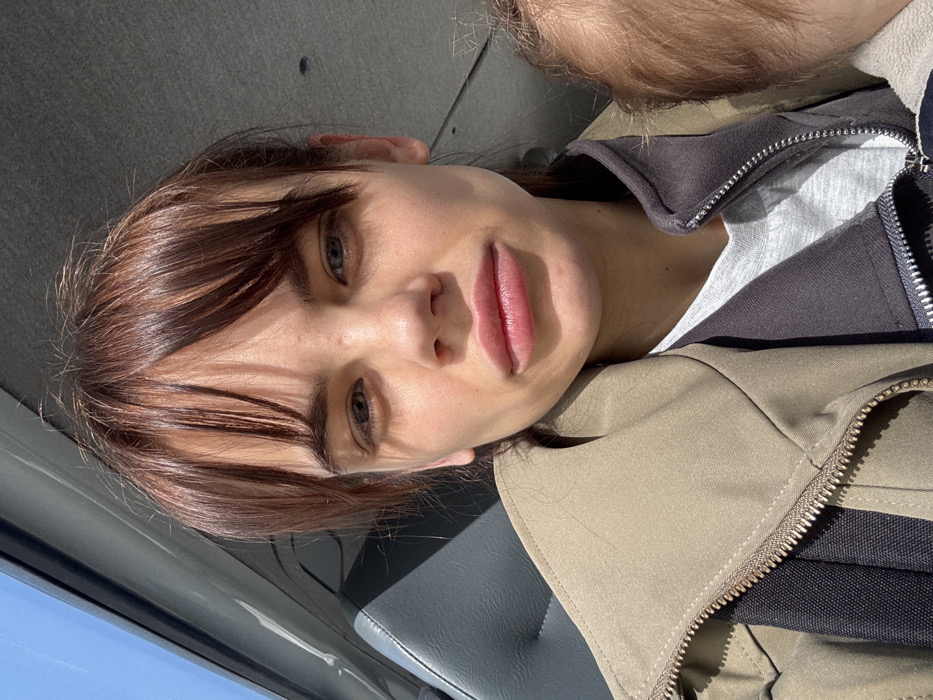 A close-up, selfie-style image depicts a young adult female and a partially visible child inside a vehicle located in Anapa, Russia. The female subject, positioned centrally, has fair skin, light-colored eyes, and medium-brown hair styled with bangs covering her forehead. She directly faces the camera with a neutral expression, her lips appearing full and slightly parted. She is dressed in multiple layers, including a light olive-green zippered jacket over a dark grey zippered garment and a light grey t-shirt. Strong, direct sunlight illuminates the scene, casting distinct shadows across her forehead and under her chin. To the lower right of the frame, the crown of a young child's head, with fine light-brown hair, is visible, indicating the child is held close to the woman. The vehicle's interior is discernible by a dark grey upholstered seat to the left of the woman and a light grey textured ceiling in the upper right. A segment of clear blue sky is visible through a window in the upper-left quadrant, suggesting an outdoor setting during daylight hours.