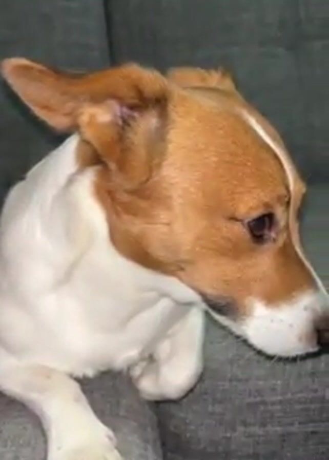 A dog sits on a gray couch. The dog is white with brown patches on its head. It's looking down and to the right. Its left paw is extended out on the couch. The background is the gray couch.