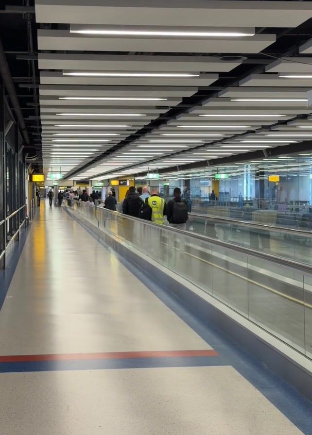 long, brightly lit corridor in what appears to be an airport terminal. People are using a moving walkway to travel down the corridor. The walkway has glass sides, and the floor is light gray with blue and red lines. The ceiling is covered with rows of long, rectangular lights. Signs with directions are visible. Several people are wearing backpacks and other luggage is implied to be nearby. One person is wearing a high-visibility yellow vest.