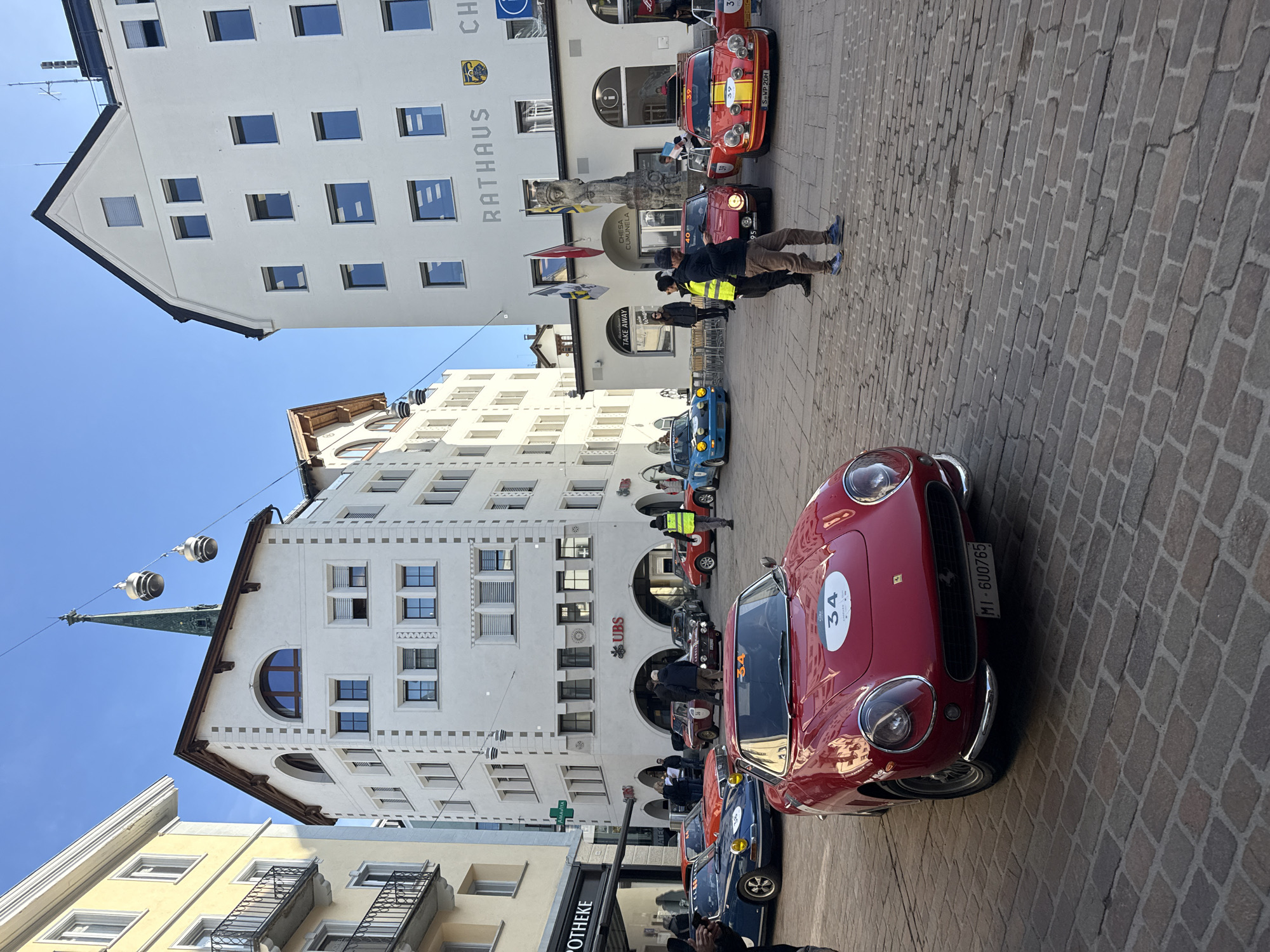 The image depicts a vibrant outdoor scene in Sankt Moritz, Switzerland, specifically a cobblestone town square surrounded by multi-story European-style buildings under a clear blue sky. In the immediate foreground, a shiny red vintage sports car, identified as a Ferrari 275 GTB, is prominently displayed. It features a circular white race number "34" on its hood and has an Italian license plate "MI 6U0765." The cobblestone pavement extends from the foreground into the midground. In the midground, several other vintage sports cars are parked or idling. To the left of the red Ferrari is a dark blue Porsche 911 with a yellow headlight cover and race number "38." Further back, a red and yellow striped car (likely an Alpine A110) with race number "39" has its driver's door open. Another red vintage car with race number "40" is positioned behind it. Additional vintage vehicles, including a light blue one and a red car with race number "36," are visible scattered throughout the square. Numerous people are gathered around the cars, appearing to be spectators or participants in a car event. One individual in a yellow high-visibility vest stands near the red and yellow striped car, looking right. Another man in a dark jacket and brown pants stands nearby, looking at a mobile phone. People are generally observing the vehicles or engaging in conversation. The background is dominated by distinct white buildings. On the right, a large white building is clearly labeled "RATHAUS" (City Hall) in grey letters, adorned with two coats of arms and flying Swiss and local flags near an arched entrance featuring a statue. Adjacent to the Rathaus, signs for "CHESA CUMUNELA" and "TAKE AWAY" are visible. To the center-left, another multi-story white building with distinctive stone detailing on its corners displays multiple "UBS" bank logos on its lower facade. Between these two main buildings, a tall, slender green spire, likely a church tower, rises towards the sky. On the far left, a light yellow building with dark wrought-iron balconies is partially visible, with "APOTHEKE" (pharmacy) visible on its ground floor. Decorative, cylindrical hanging lights are suspended across the square. The scene is illuminated by bright daylight, casting visible shadows.