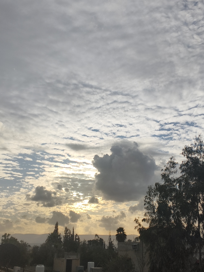 The image displays an outdoor elevated landscape view, likely captured during dawn or dusk, in Unknown, Unknown. The upper two-thirds of the frame are dominated by a sky filled with layered white and grey altocumulus and stratocumulus clouds, with visible patches of blue sky. A diffuse, bright yellowish-white light source, consistent with the sun, is positioned in the lower-left portion of the sky, partially obscured by clouds. A distinct, large, dark grey cumulus cloud is present to the right of this light source. The lower third of the image presents a mixed urban and vegetated area. A hazy, distant mountain range or hills forms the background horizon. The midground features various trees and dense foliage, appearing largely in silhouette against the brighter sky. Notable vegetation includes a tall, multi-trunked tree with narrow leaves on the far right, and scattered smaller trees including a palm tree and coniferous-like trees. Several low-rise, flat-roofed structures are visible, some equipped with white cylindrical water tanks and at least one dark, parabolic satellite dish on a rooftop in the center-left. No individuals, discernible actions, or interactions are visible within the scene.
