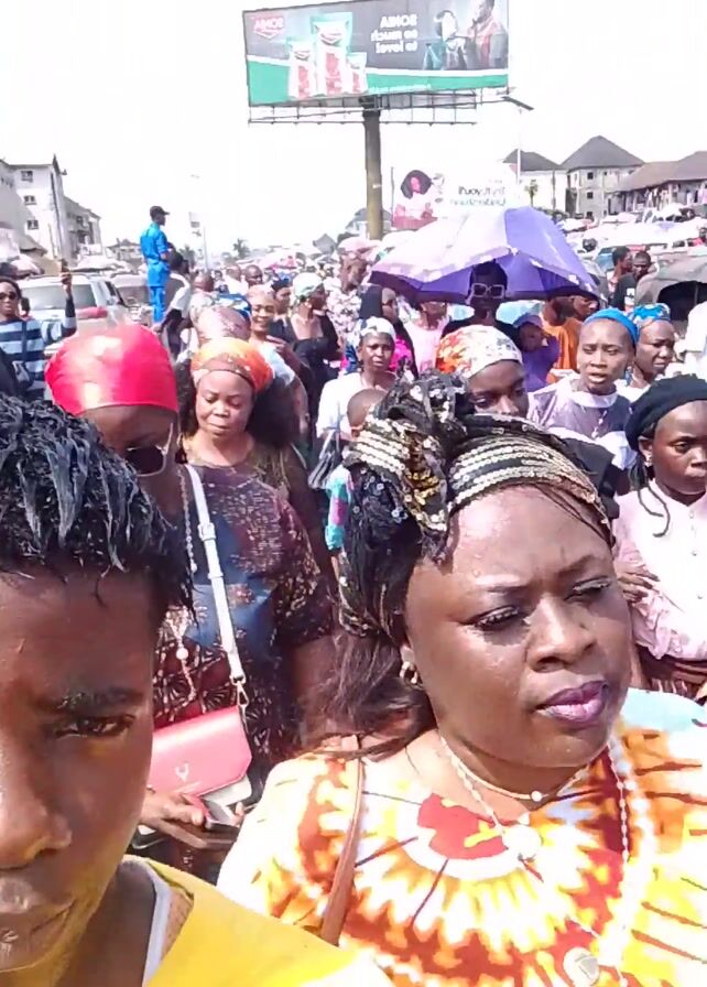 close-up of a person with wet, curly hair and a yellow shirt, possibly taking a selfie. The camera is pointed towards a crowd of people with buildings and a billboard in the background. Many individuals are wearing colorful clothing and head coverings. Some people are walking in the background. The sky is visible and partially obscured by the buildings. The video appears to be taken from a low angle within the crowd.