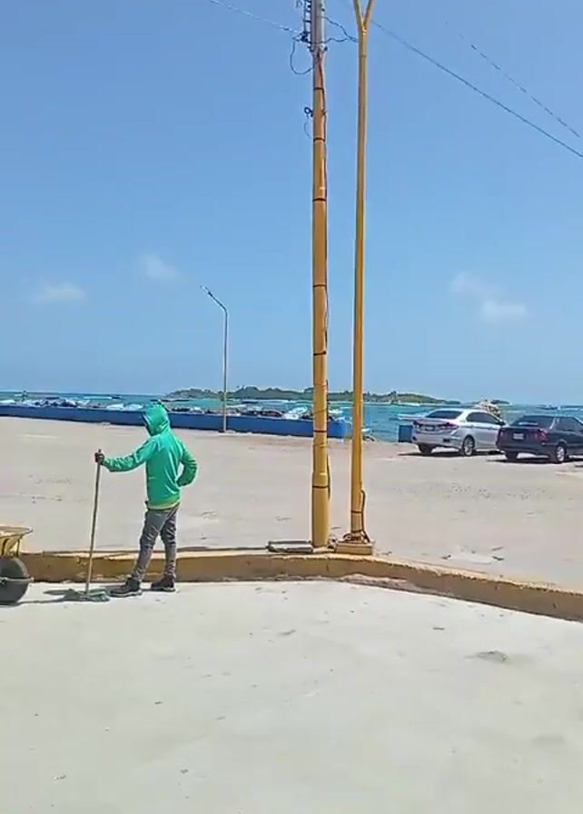 paved area with a yellow curb, a street light, parked cars, and boats on the water. Two men wearing hats and work clothes sweep and collect debris into a wheelbarrow. Another man wearing a plaid shirt, shorts, and a hat walks across the paved area carrying a green bag. The sky is blue.
