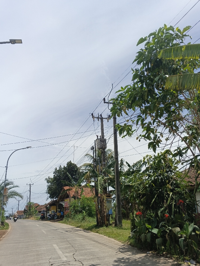 A rural road stretches into the distance, lined with power lines and poles. Lush greenery, including banana trees and flowering plants, grows alongside the road. Small buildings with red-tiled roofs are visible in the background. A couple of motorcycles are parked near one of the buildings. The sky is bright with scattered clouds.