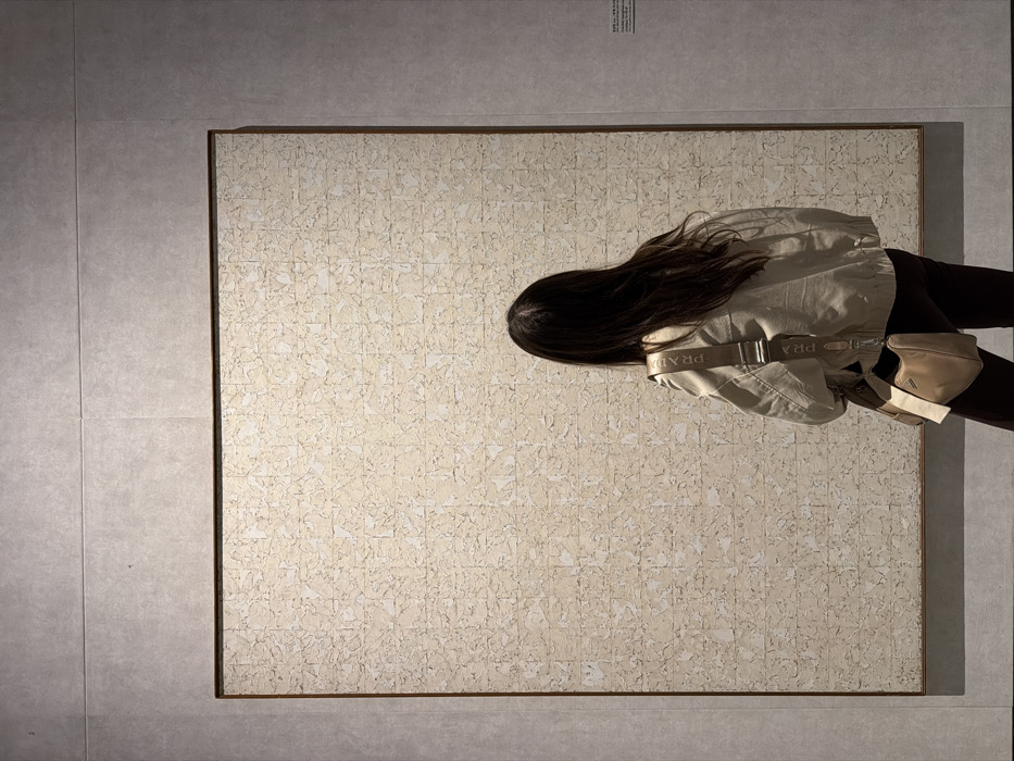 An overhead shot captures a woman examining a framed, off-white artwork composed of small, square tiles. Her dark hair falls towards the art, while she wears a light beige jacket and dark pants. A Prada branded strap is visible across her body, connecting to a small pouch. The artwork is presented on a gray, tiled wall, with a small informational plaque affixed to the wall above the art piece. The composition has a muted color palette, emphasizing the textures and patterns of the artwork and its surroundings.