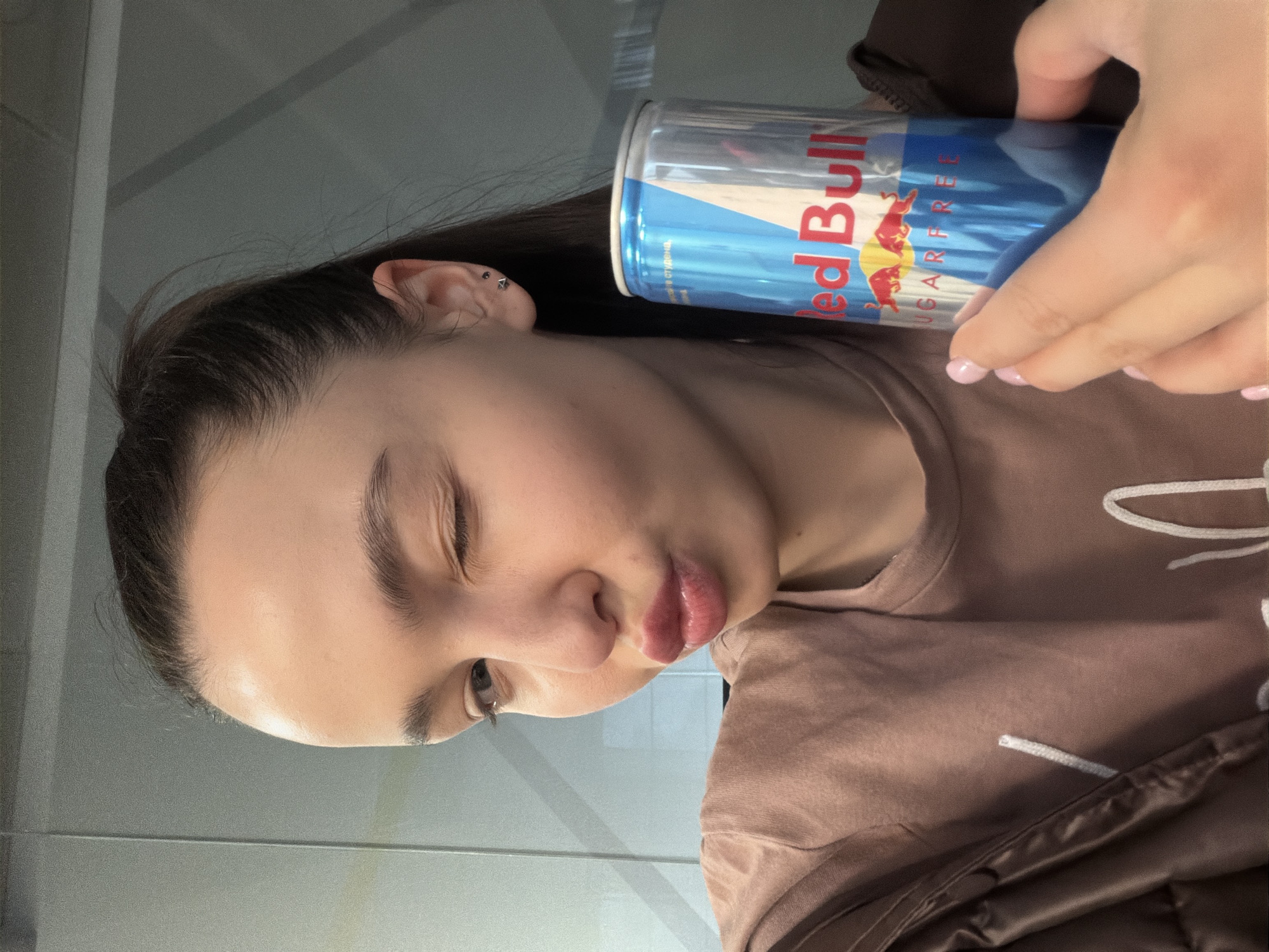 A woman is holding a can of Red Bull Sugarfree. She has dark hair, light skin, and a piercing in her ear. The can is blue and silver with red writing. The woman is wearing a brown t-shirt. The photo appears to be taken indoors. There is no information available in the image to identify the location as Sofia, Bulgaria.
