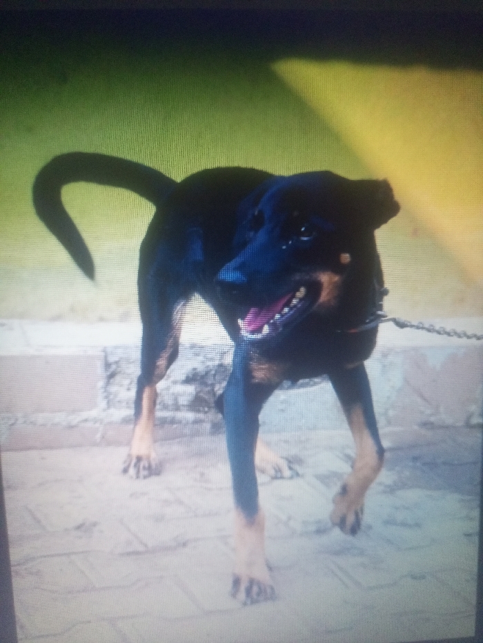 The scene captures a black and tan dog standing on a paved outdoor surface in Akwanga, Nigeria