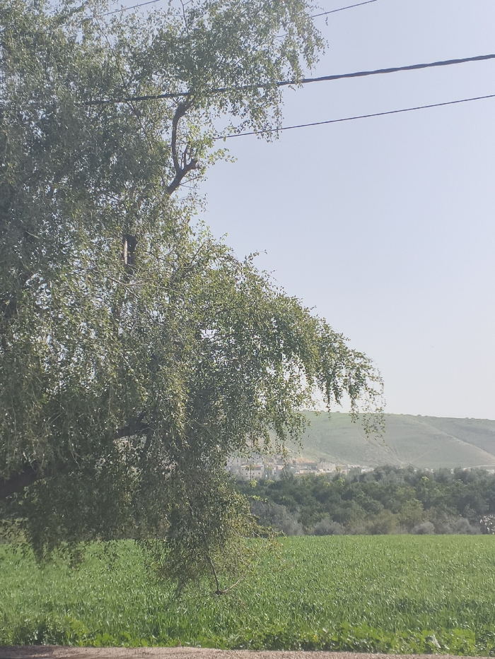 This image displays a rural landscape under a clear, light blue sky, located in Unknown, Unknown. A large deciduous tree with dense green foliage occupies the left side of the frame, its branches extending towards the center. Two black electrical wires are visible traversing horizontally in the upper portion of the image, partially obscured by the tree's leaves. The mid-ground features an expansive field of vibrant green, low-growing vegetation, consistent with an agricultural crop. Beyond this field, a line of darker green trees or shrubs forms a visual barrier, behind which a cluster of light-colored buildings, indicative of a small settlement, is discernible. In the distant background, gently rolling green hills with visible contours rise under the clear sky. The immediate foreground shows a narrow strip of reddish-brown ground. No individuals are present, and no specific actions or interactions are depicted.