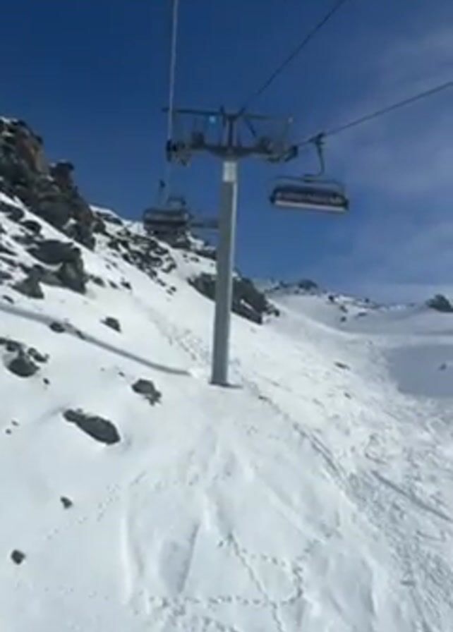A video depicts a ski lift ascending a snow-covered mountain under a clear blue sky
