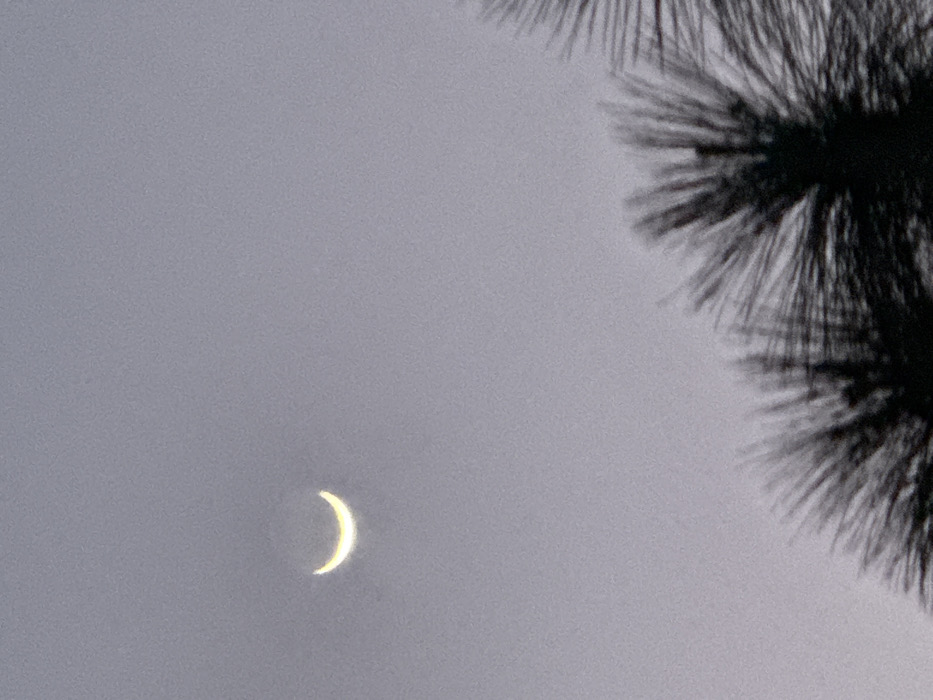 The scene is set in Jupiter, United States. The image captures an outdoor environment under a light gray sky, indicative of dawn, dusk, or heavy overcast. Dominating the upper-left quadrant is a brilliant, yellow-white crescent moon, its illuminated arc clearly defined against the muted sky. In the lower-right foreground, a dark, silhouetted mass of vegetation is visible, characterized by numerous fine, needle-like elements consistent with either pine branches or the fronds of a palm tree, partially obscuring the lower sky. There are no discernible human figures, animals, man-made structures, or specific actions or interactions depicted.