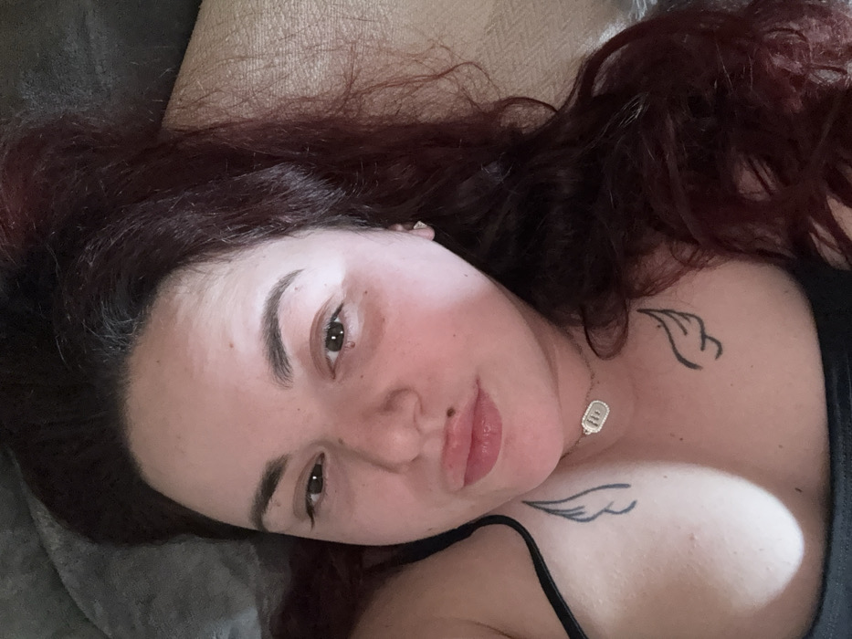 A close-up portrait depicts an adult female subject lying in an indoor setting within the city of Dortmund, Germany. The subject has long, wavy, dark red hair, which frames her face. Her complexion is fair with visible facial redness and blotches, including a reddish discoloration beneath her left eye. Her dark brown eyes are open, and she is looking directly at the camera. Her lips are pursed in a 'duck face' expression, with a small mole visible above her upper lip. She is wearing a dark-colored top, possibly a tank top or bra, with a thin strap visible over her left shoulder. A thin, silver-colored necklace with an oblong pendant featuring an unknown design is present on her neck. Small, triangular stud earrings are visible in both earlobes. Two black, stylized wing tattoos are visible on her upper chest, one on each side. The background consists of soft, textured fabric in gray and light brown tones, indicating an upholstered surface.