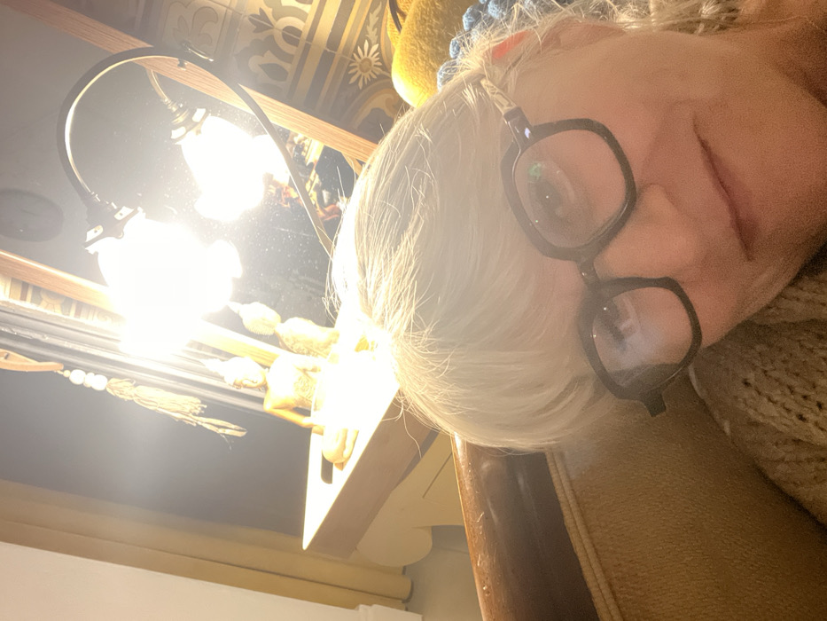 A slightly blurry selfie shows a person with white hair and black-framed glasses. They are wearing a tan sweater and seated in a leather chair. A bright lamp illuminates a desk or table, reflecting strongly. The ceiling has decorative patterns. The composition of the image is tilted, with the person's face at the top right corner of the frame.