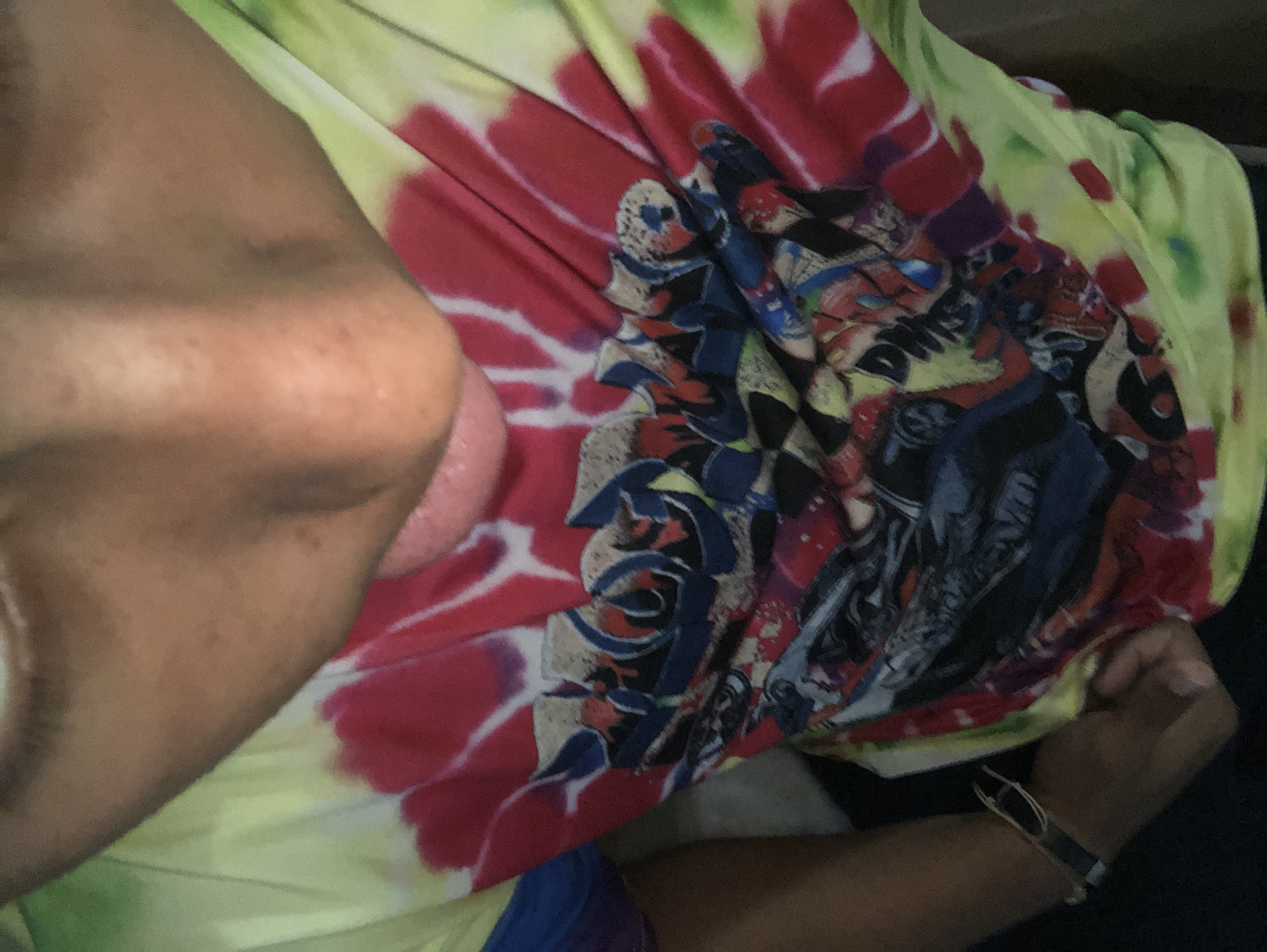 person's face and upper torso. The person's tongue is visible. They are wearing a colorful shirt with a tie-dye pattern and a graphic design. A bracelet is visible on their wrist. The background is dark. The location is unknown, including whether it is in Altagracia, Venezuela.