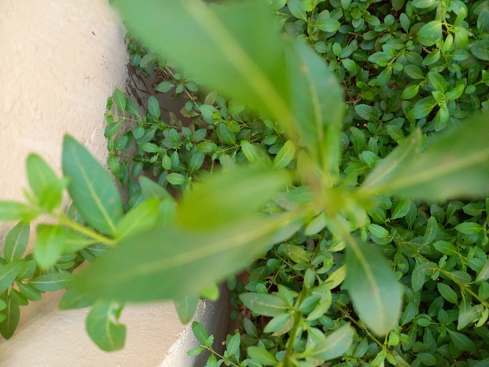 A dense patch of small, bright green leaves covers the ground, interspersed with slender stems. Larger, elongated leaves of a plant obscure the foreground, their sharp lines contrasted by the tiny, rounded leaves below. Adjacent to the foliage, a pale, rough-textured surface, possibly a wall, anchors the scene. The composition is dominated by varying shades of green, creating a lush, verdant feel.