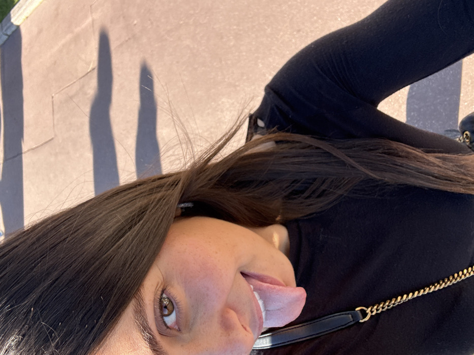 The image depicts a female subject in a close-up, high-angle perspective, likely a selfie, taken outdoors in Cannes, France. The subject, positioned in the foreground, is seen from the upper torso upwards. She has long, dark brown hair flowing over her shoulders and wears a dark, long-sleeved top with a visible shoulder detail on her right side. A black leather strap with a gold chain, belonging to a shoulder bag, is visible across her chest. Her left eye is open, revealing a brown iris, and freckles are visible on her cheek. A silver-colored hoop earring is present in her left ear. The subject is actively sticking her tongue out towards the camera in a playful gesture. The background shows a reddish-brown paved pedestrian path or walkway, with visible seams and a textured surface. Along the upper left edge of the path, a strip of green grass is visible. Bright sunlight illuminates the scene, casting distinct, elongated shadows of unseen figures or objects onto the path behind the subject, indicating a clear, sunny day with a moderate sun angle. The outdoor environment, characterized by a paved path and greenery, is consistent with a promenade or public park area within the city of Cannes.