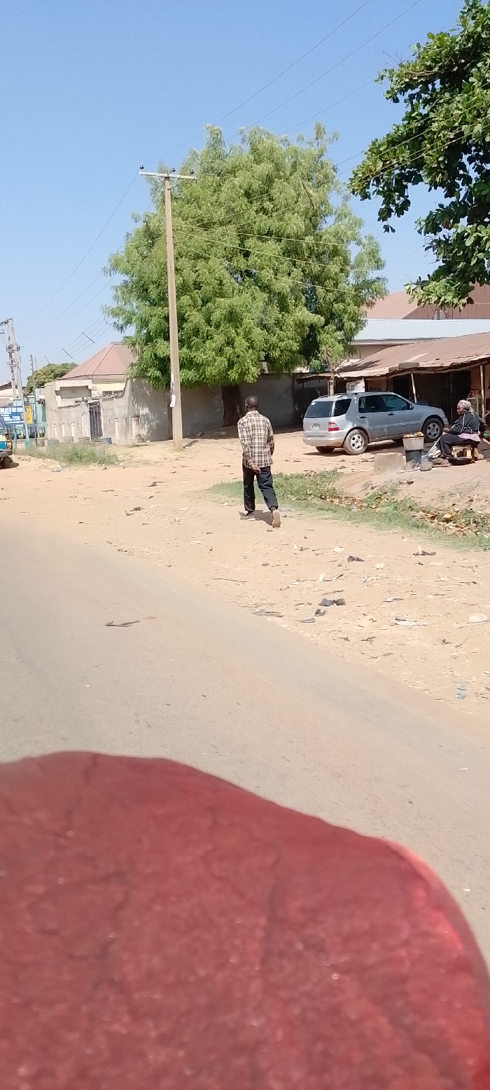 The image portrays an outdoor street scene in Television, Nigeria, under a clear, bright blue sky. A dark-skinned male subject, dressed in a light-colored plaid shirt and dark trousers, walks from left to right on a dusty, unpaved shoulder bordering a paved road, observed from behind. A tall, light-brown utility pole with multiple overhead wires is centrally positioned behind him, adjacent to a large, vibrant green tree with dense foliage. To the right, a silver SUV is parked on the dirt shoulder in front of a single-story building featuring a brown corrugated roof. Further right, a second individual is seated on a low stool, positioned beside an outdoor cooking or heating apparatus. Additional single-story buildings with various roofs are visible in the background. The ground consists of an asphalt road and extensive dusty dirt areas with sparse green vegetation and scattered debris. A blurry, reddish-brown textured object occupies the lower portion of the foreground.