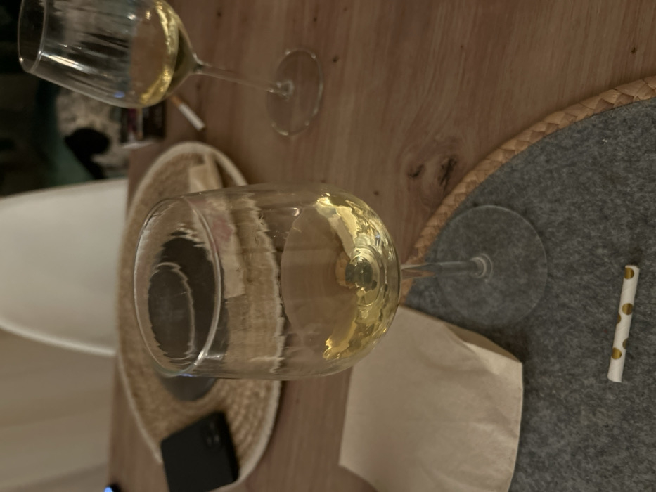 Two wine glasses, both filled with a golden liquid, sit on a wooden surface. A coaster made of woven material is under one glass, accompanied by a tan napkin and a straw with gold polka dots. Next to this arrangement, a gray placemat rests partially in the frame. The other wine glass is positioned higher up in the frame near a small, tan napkin. A smartphone is placed near the bottom of the image.