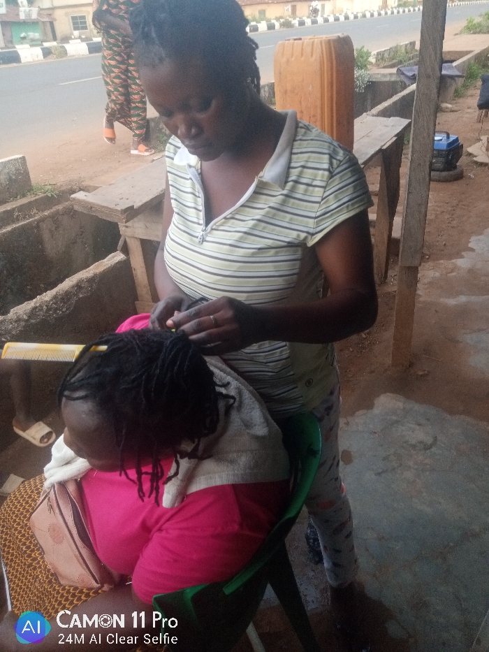 The scene depicts an outdoor hair braiding session in Unguwan Rimi, Nigeria