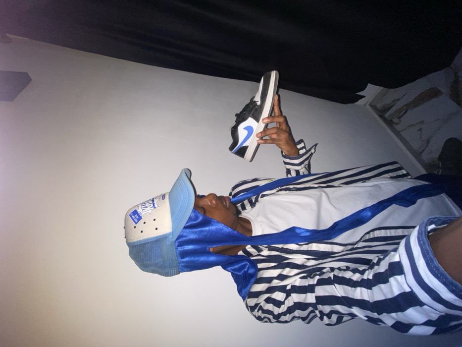 A man wearing a hat and a striped shirt with blue trim is lying down. He is holding up a sneaker with a blue Nike swoosh. The background consists of a white wall, a dark curtain, and a section of marble flooring. The angle of the image is slightly tilted.