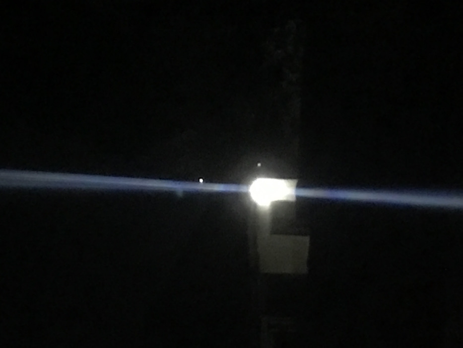 A nighttime view reveals a bright light emanating from a fixture on a pole, casting a strong, horizontal beam. A fainter light source is visible along the beam's path. The background is dark, with an indistinct object potentially a tree trunk partially visible above the light fixture. The light and pole dominate the scene against the backdrop of the night sky.
