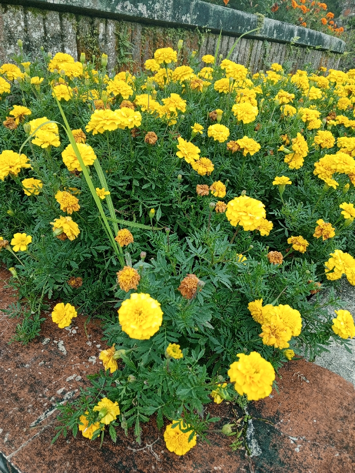 A vibrant display of yellow marigolds fills the frame, their petals creating a cheerful, sunny scene. The flowers grow densely, interspersed with lush green foliage and occasional dried blossoms. The arrangement is situated beside a textured brick ledge, adding contrast to the soft, natural elements. In the background, a weathered concrete wall hints at a structured garden setting.